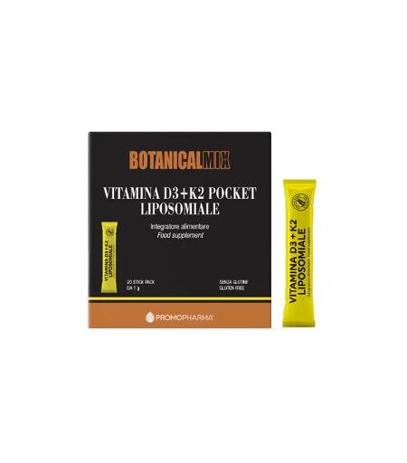 BOTANICAL MIX - VITAMINA D3+K2 POCKET LIPOSOMIALE - Descrizione Prodotto a base di vitamina D combinata con vitamina K per il massimo beneficio per ossa e arterie. La vitamina D contribuisce a normali livelli di calcio nel sangue e assieme alla vitamina K contribuisce al mantenimento di ossa normal… ...