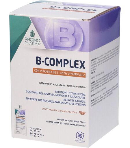B-Complex Promopharma 20 pouchIntegratore AlimentareA cosa serve B-Complex PromopharmaB-Complex Promopharma integra un complesso di vitamine B (B6, B2, B12, acido pantotenico e niacina) che contribuiscono al normale metabolismo energetico e alla riduzione di stanche ...