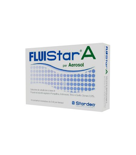 Fluistar A - Descrizione Dispositivo medico ad uso inalatorio a base di propoli ed estratti vegetali di pompelmo, echinacea, timo e sodio cloruro 2,0%. Fluistar A è una soluzione pronta all'uso per aerosol di colore giallo tenue, lievemente ipertonica, sterile. Fluistar A è indicato nelle affezioni… ...