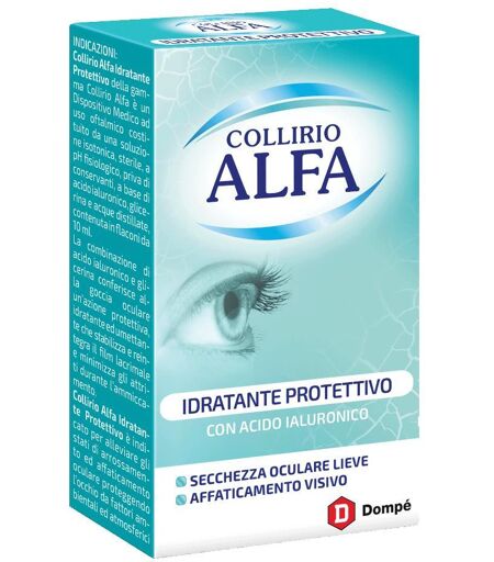 COLLIRIO ALFA - IDRATANTE PROTETTIVO - Descrizione Dispositivo medico ad uso oftalmico indicato per alleviare gli stati di arrossamento ed affaticamento oculare, proteggendo l'occhio da fattori ambientali ed atmosferici (inquinamento, smog, salsedine, acqua clorata, vento, polvere, fumo, clima secc… ...