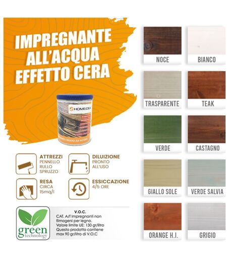 IMPREGNANTE PROFESSIONALE  Ideale per trattare il legno destinato sia all'interno che all'esterno. Consigliamo per i prodotti in legno da interno ed esterno il nostro HOME IDEA ITALIA Color, testato direttamente in azienda sul nostro legname e approvato con un'ottima resa nel tempo. Garantiamo un ottimo rapporto qualità prezzo ai nostri clienti e una vasta gamma di colori. HOME IDEA ITALIA Color è a base d'acqua cerato, penetra a fondo nelle porosità del legno rendendolo idrorepellente e proteggendolo dalla pioggia battente, dall'aggressione delle muffe, funghi, tarli e insetti. Non forma alcuna pellicola ma conferisce al legno un piacevole e naturale effetto cerato. Filtra i raggi ultravioletti e attenua l'invecchiamento causato dalla degradazione della legnina. Pigmenta e tonifica le venature esaltandone il fascino caldo e particolare che solo il legno sa darci. Per legno da interni o esterni (effetto cerato) Pronto all'uso Protegge a lungo nel tempo Lascia traspirare il legno ...