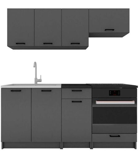 CUCINA COMPLETA - Set compatto e funzionale con mobili pensili e a terra, ante e cassetto - Il suo stile minimalista e il design moderno la rende ideale per arredare qualsiasi ambiente con esigenze di spazio - Antracite. STRUTTURA E UTILIZZO - Rendi funzionale la tua cucina con questi mobili dal design compatto ed essenziale, pensati per appartamenti con esigenze di spazio - Massima funzionalit in uno spazio minimo: questa cucina compatta dal design moderno la soluzione ideale per ambienti urbani, monolocali o piccoli appartamenti - La parete da cucina perfetta per organizzare al meglio la preparazione dei pasti e contenere elettrodomestici - La dispensa un pratico mobile multifunzione, ideale per contenere stoviglie, alimenti, bevande. DIMENSIONI IN CM - Mobili pensili: 180x28,8 h56 cm - Mobili a terra: 180x60 h85 cm. CARATTERISTICHE TECNICHE - Cucina composta con mobili pensili con ante battenti e a ribalta, mobili fissi con ante battenti e cassetto, ripiani interni inclusi ...