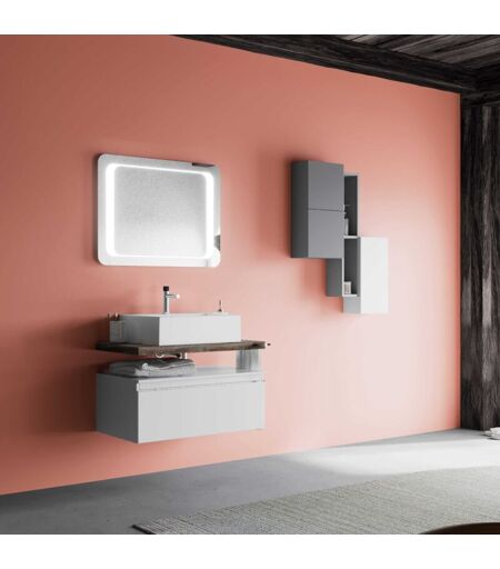 KIAMAMI VALENTINA - Mobile Bagno Sospeso 80Cm Cassetto Bianco, Top Rovere Fossile, Lavabo Lagos