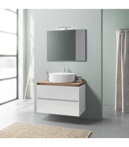 MOBILE BAGNO SOSPESO 80CM BIANCO LUCIDO CON TOP ROVERE NATURALE E LAVABO APPOGGIO Il mobile bagno sospeso da 80cm Elba coniuga un design fresco ed accattivante con un arredo capiente e funzionale. La struttura in bianco lucido dispone di due capienti cassetti, con sponde laterali in legno e chiusura rallentata. Si completa con un top in legno rovere naturale su cui posizionare il lavabo da appoggio compreso nell'offerta. La composizione si completa con la specchiera 80x60. larghezza 80cm, profondità 46cm, altezza 54cm struttura bianco lucido , top rovere naturale lavabo in ceramica bianco L'offerta non comprende la rubinetteria, lampada per lo specchio ed il kit per il fissaggio. Kiamami Valentina, cambia volto al tuo bagno, con prodotti di qualità e dall'ottimo rapporto qualità/prezzo. La collezione Elba è declinata in due tonalità chiare che rendono il bagno luminoso ed arioso. MOBILE BAGNO SOSPESO 80CM BIANCO LUCIDO, TOP CON LAVABO D'APPOGGIO E SPECCHIO BASE Mobile bagno sospeso ...