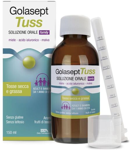 Golasept Tuss Family - Descrizione Dispositivo medico. Soluzione orale, tosse secca e grassa. Aroma frutti di bosco. - Senza glutine e lattosio. - Modalità d'uso - 2,5 ml due volte al giorno per bambini da 1 a 3 anni. - 5 ml due volte al giorno per bambini da 3 a 12 anni. - 5 ml fino a quattro volt… ...