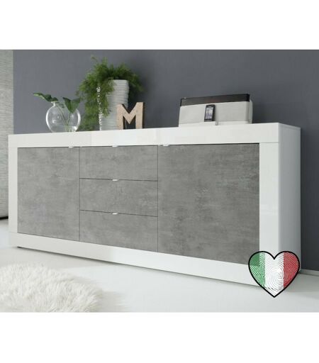 STILPROJECTSTORE Credenza moderna bassa da soggiorno Bianco laccato lucido, 2 ante e 3 cassetti color Cemento - Basic