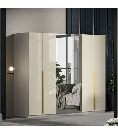 VERSIONE CON DUE ANTE SPECCHIO CENTRALI VERSIONE SENZA SPECCHI Armadio 6 ante battenti Armadio battente stile minimal con maniglie. 6 Ante battenti laccate beige, disponibile anche con 2 ante centrali a specchio. Struttura melaminico quercia bianca. Prodotto fornito smontato con libretto di istruzioni. Cerniere ammortizzate 3 ripiani appendiabiti 100% Made in Italy DIMENSIONI: L. 274 cm x P. 60 cm x h. 218 cm OPZIONI: maniglia color oro o argento ...