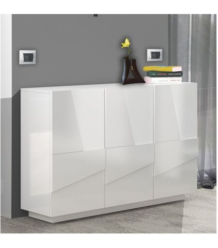 Credenza con 3 ante battenti, colore bianco laccato lucido, in legno melaminico. Dimensioni ingombro 121x39,2x86 cm Credenza utile sia in soggiorno sia in sala pranzo, mobile pratico e capiente di design originale ed elevata funzionalità. Mobile dotato di tre ante battenti rese particolari da un motivo geometrico in rilievo sulla superficie che rendono il mobile del tutto moderno. Al suo interno ci sono due ripiani in legno che garantiscono ampio spazio di utilizzo e di archiviazione. Look minimal che dona un tocco di classe al salotto e personalità all'ambiente. È adattabile a diversi stili di arredo grazie alla sua forma fantasiosa. Strutture e ante in melaminico laccato bianco lucido certificato FSC, 100% made in Italy. Viene fornito in kit di montaggio e dotato di istruzioni semplici e dettagliate. Caratteristiche Tecniche: Dimensioni ingombro (LxPxH): 121x39,2x86 cm 3 ante battenti Colore: bianco laccato lucido Materiale: legno melaminico Certificato FSC Dimensione confezione ...