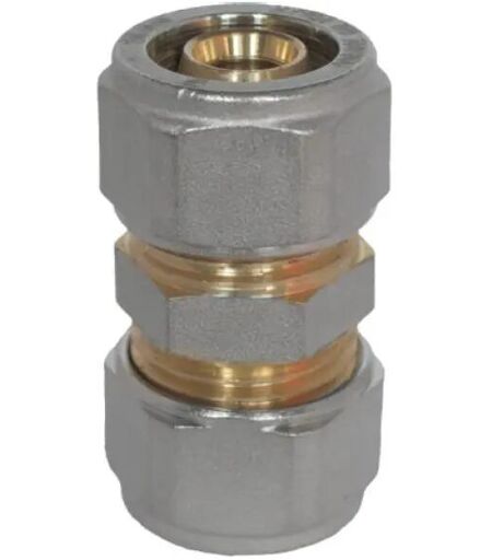 Raccordo a stringere nichelato realizzato in ottone stampato a caldo adatto al serraggio del tubo multistrato. raccordo intermedio. per impianti di riscaldamento,raffrescamento e sanitari ...