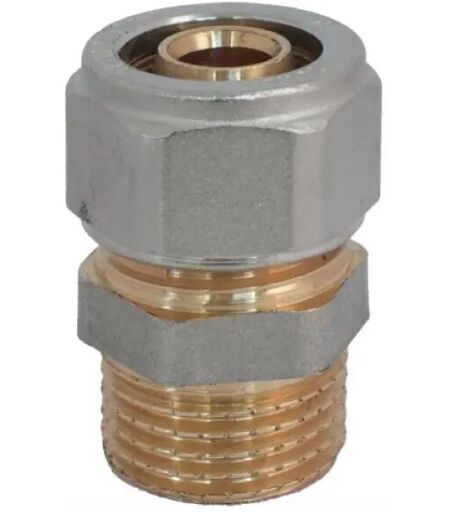 Raccordo a stringere nichelato realizzato in ottone stampato a caldo adatto al serraggio del tubo multistrato. raccordo filetto maschio. per impiantidi riscaldamento,raffrescamento e sanitari ...