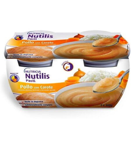 NUTILIS PASTI Pollo con Carote è un pasto pronto dalla consistenza cremosa ed omogenea, indicato per il pranzo o la cena. E' ricco di proteine e calorie.CaratteristicheGrazie al suo profilo nutrizionale attentamente studiato, garantisce un apporto calibrato di nutrienti all'organismo;è nutrizionalmente completo, ricco di minerali e vitamine, proteine animali e vegetali (21g) e calorie (375kcal) in un volume ridotto (300g).ha una consistenza cremosa ed omogena, che può essere modulata a piacimento e in base alle esigenze di consistenza e di gusto aggiungendo diluenti o lubrificanti naturali, come ad esempio brodo, olio o burro o addensanti per aumentarne la viscosità. NUTILIS PASTI gusto Pollo con Carote è un un alimento dietetico destinato a fini medici speciali, per il trattamento nutrizionale della disfagia. NUTILIS PASTI è specificataamente studiato per rispondere alle esigenze alimentari delle persone con problematiche di masticazione o deglutizione. Nutilis Pasti può essere utilizzato come unica fonte di nutrimento con il consumo di almeno 4 confezioni al giorno. In caso di consumo inferiore, il prodotto deve essere inserito in un regime dietetico più completo.PREPARAZIONE:- NUTILIS PASTI è pronto per essere consumato. Il prodotto può essere scaldato a bagnomaria o nel forno a microonde, prima di scaldare il prodotto, togliere il tappo e rimuovere completamente la pellicola di alluminio di protezione. Prima del consumo mescolare e verificare la temperatura. Impiattare a piacimento.- NUTILIS PASTI ha una consistenza cremosa modulabile: è possibile modificarne la consistenza aggiungendo diluenti o lubrificanti naturali, come ad esempio brodo, olio o burro. Per aumentarne la viscosità aggiungere addensansanti, come ad esempio NUTILIS POWDER, fino al raggiungimento della consistenza desiderata e secondo le indicazioni. Impiattare a piacimento.aturali, come ad esempio brodo, olio o burro. Per aumentarne la viscosità aggiungere addensansanti, come ad esempio NUTILIS POWDER, fino al raggiungimento della consistenza desiderata e secondo le indicazioni. Impiattare a piacimento. Conservare in luogo fresco e asciutto lontano da fonti di calore. Analisi mediaPer 100 mlEnergia555 kJ132 kcalProteine6,9 gCarboidratizuccheri13,2 g1,4 gGrassisaturimonoinsaturipolinsaturi5,7 g2,2 g2,7 g0,8 gFibre0,3 gOligomineraliSodioPotassioCloroCalcioFosforoMagnesio120 mg170 mg130 mg50 mg80 mg11 mg;MineraliFerroZincoRameManganeseFluoroMolibdenoSelenioC romoIodio1,0 mg0,8 mg0,12 mg0,4 mg0,18 mg10 mcg10 mcg4,8 mcg9,8 mcgVitamineVitamina AVitamina D3Vitamina EVitamina KVitamina CVitamina B1Vitamina B2Vitamina B6Acido Pantotenico (Vitamina B5)Acido folicoNiacina (Vitamina B3)Vitamina B12Biotina100 mcg-RE1,0 mcg0,9 mg-alfa-TE23 mcg10 mg0,26 mg0,20 mg0,16 mg-NE0,8 mg22 mcg1,8 mg0,55 mcg6,5 mcgDistribuzione caloricaProteine21,00 En%Grassi38,50 En%Carboidrati40,00 En%Fibre0,50 En% ...