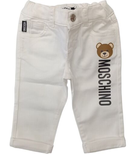 Pantalone bianco MOSCHINO con logo mero e stampa orsetto TOY sulla gamba. ...
