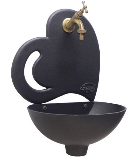 Fontana a muro mod. Afrodite con rubinetto cod. 303 in ottone brunito Composta da: Vasca e frontale in fusione d’alluminio, con trattamento di cromatazione anticorrosivo, verniciati a polvere epossidica colore antracite. Rubinetto in ottone brunito Misure frontale: Larghezza massima 34 cm Altezza totale 31,5 cm Altezza foro rubinetto dalla base del frontale 26,5 cm Misure vasca: Larghezza massima 33 cm Superficie a parete 24 cm Sporgenza dal muro 21 cm Altezza 14,5 cm Foro di scarico 1" 1/4 filettato Interassi fori per fissaggio a parete 16 cm Sporgenza rubinetto 10 cm , attacco 1/2" ...