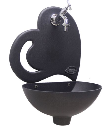 Fontana a muro mod. Afrodite con rubinetto cod. 303 in ottone cromato Composta da: Vasca e frontale in fusione d’alluminio, con trattamento di cromatazione anticorrosivo, verniciati a polvere epossidica colore antracite. Rubinetto in ottone cromato Misure frontale: Larghezza massima 34 cm Altezza totale 31,5 cm Altezza foro rubinetto dalla base del frontale 26,5 cm Misure vasca: Larghezza massima 33 cm Superficie a parete 24 cm Sporgenza dal muro 21 cm Altezza 14,5 cm Foro di scarico 1" 1/4 filettato Interassi fori per fissaggio a parete 16 cm Sporgenza rubinetto 10 cm , attacco 1/2" ...