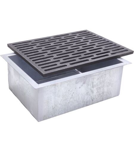 > Misure: Griglia: 30x40 cm Cassetto incluse alette laterali: 29x39x14h cm Interne cassetto: 25x35x14h cm Alette: 2 cm cad Materiali: Griglia: ghisa Cassetto: lamiera zincata ...
