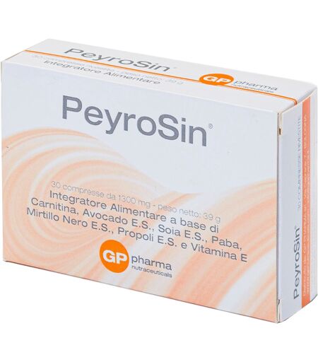 PeyroSin - Descrizione Integratore coadiuvante per il trattamento terapeutico della malattia di Peyronie. La sua composizione è inoltre indicata per la salute della cute e degli annessi cutanei. Ingredienti Vitamina E L - carnitina acido para - amino - benzoato mirtillo nero estratto secco prop… ...