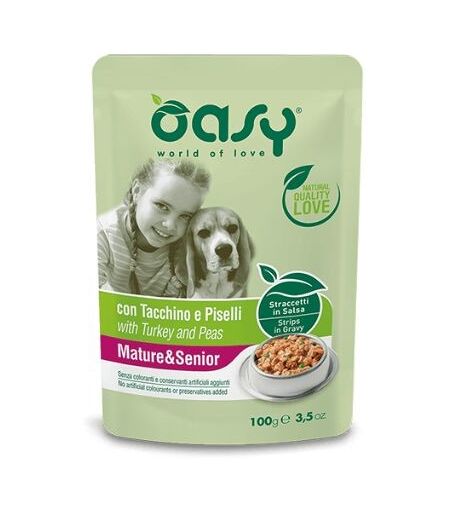 Oasy Dog Straccetti in Salsa Mature con Tacchino e Piselli Busta 100gr