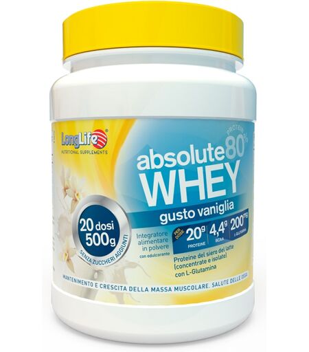 LongLife - absolute WHEY - Descrizione Integratore alimentare di proteine ad elevato valore biologico utile nelle situazioni di ridotto apporto proteico con la razione alimentare o di aumentato fabbisogno. Le proteine contribuiscono alla crescita ed al mantenimento della massa muscolare e aiutano l… ...