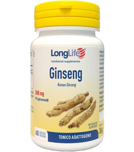 LongLife Ginseng 500 mg - Descrizione Integratore alimentare di ginseng titolato al 5% in ginsenosidi efficace tonico - adattogeno, utile in caso di stanchezza fisica e mentale. - Ingredienti Ginseng coreano bianco radice (Panax ginseng C. A. Meyer), maltodestrina; antiagglomeranti: magnesio steara… ...