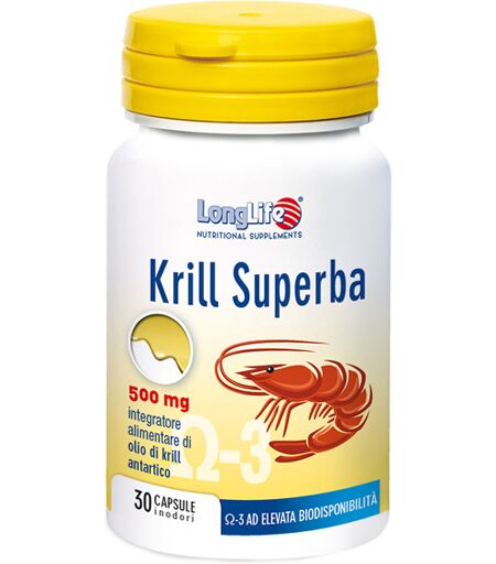LongLife Krill Superba 500 mg - Descrizione Integratore alimentare per il metabolismo dei lipidi plasmatici di olio di krill dell'Antartico ricco di omega - 3 ad elevata biodisponibilità e astaxantina, con attività antiossidante. - Ingredienti Krill antartico; capsula di gelatina di pesce. Contiene… ...