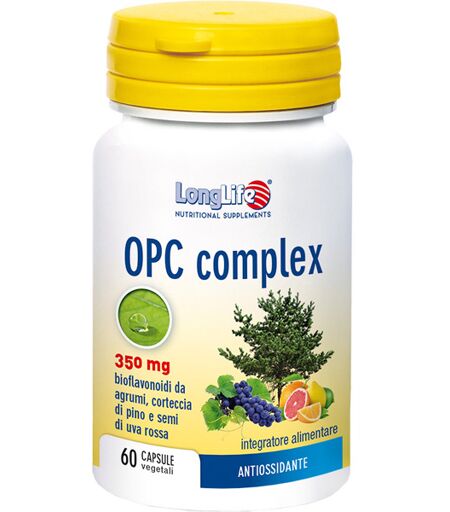 LongLife OPC complex 350 mg - Descrizione Integratore alimentare di OPC con bioflavonoidi da agrumi, corteccia di pino ed estratto di semi d'uva rossa, composti utili per la funzionalità del microcircolo (pesantezza delle gambe) e dell'apparato cardiovascolare. Adatto a vegetariani e vegani. - Ingr… ...