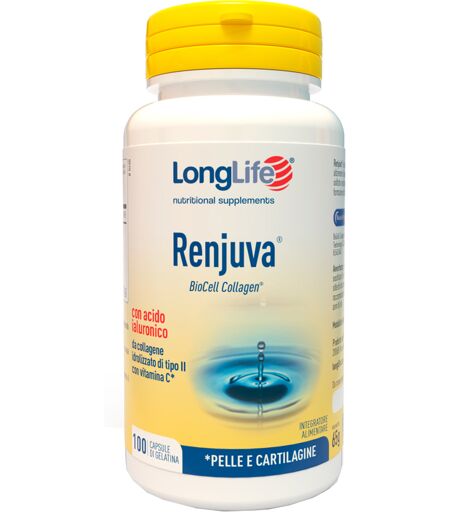 LongLife Renjuva - Descrizione Integratore per la pelle e la bellezza. Contribuisce alla normale formazione di collagene per la funzionalità di cartilagine e pelle. - Ingredienti BioCell Collagen (estratto di cartilagine purificata da sterno di pollo), vitamina C; antiagglomeranti: magnesio stearat… ...