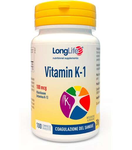 LongLife Vitamin K 100 mcg - Descrizione Integratore alimentare di vitamina K1 utile per la normale coagulazione sanguigna e il mantenimento di ossa normali. Adatto ai vegetariani. - Ingredienti Agente di carica: calcio fosfato bibasico; addensanti: cellulosa microcristallina; antiagglomeranti: aci… ...