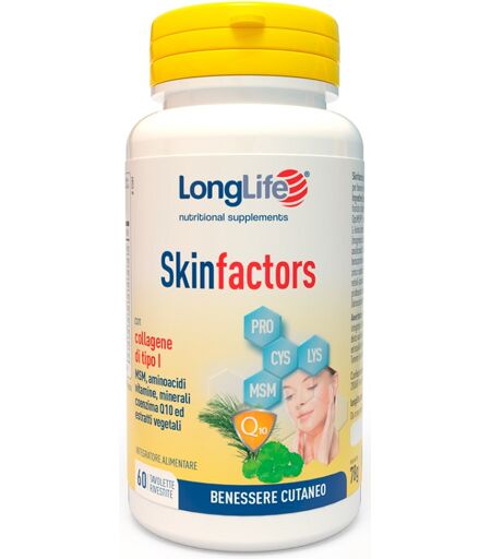 LongLife - Skinfactors - Descrizione Integratore alimentare di vitamine, minerali e altri nutrienti utili per favorire il benessere cutaneo. Ingredienti Equisetum arvense parti aeree tit. 7% silicio, agente di carica (calcio fosfato bibasico), acido L - ascorbico, collagene idrolizzato di tipo I (b… ...