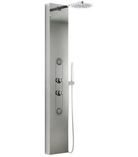 Pannello doccia in acciaio inox 304,spessore 1mm getto superiore a pioggiacon soffione in abs. getti idromassaggio per il corpo. doccino con manigliain abs. flessibile in acciaio inox da 1,5mt per il collegamento con la doccetta. regolatore in lega di zinco. dimensioni: (lxpxh). 22x7,5x140. coloreoro satinato ...