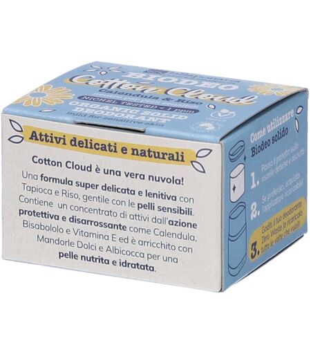 La Saponaria Deodorante Biodeo Cotton Cloud Il BioDeo solido Cotton cloud è neutro e delicato come una nuvola. Ha una formula super delicata e lenitiva con tapioca e riso che lo rende perfetto per le pelli più sensibili. Contiene un concentrato di attivi dall’azione protettiva e disarrossante come Calendula, Bisabololo e Vitamina E ed è arricchito con Mandorle Dolci e Albicocca per una pelle nutrita e idratata. Cotton Cloud è privo di profumazione e si prende cura delle tue ascelle e le lascia libere di traspirare! Combatte naturalmente i cattivi odori riequilibrando il microbioma e preservando la flora batterica buona. La sua azione è efficace, la sua texture super confortevole e infine non ostruisce i pori! Il formato concentrato e compatto rende Cotton Cloud ideale per essere infilato in valigia o nel borsone della palestra e combattere gli odori spiacevoli anche fuori casa. Modo d'uso: Massaggia Cotton Cloud direttamente sulle ascelle deterse e asciutte: a contatto con il calore del corpo si scioglierà e lascerà sulla tua pelle un velo di dolcezza. Puoi abbinare Cotton Cloud all’applicatore ricaricabile Kiima: custodirà il tuo prezioso Biodeo in ogni occasione, anche fuori casa. Ingredienti: Tapioca Starch*, Helianthus Annuus Seed Oil*, Caprylic/Capric Triglyceride, C10-18 Triglycerides, Zinc Ricinoleate, Coco-Caprylate/Caprate, Hydrogenated Castor Oil, Triethyl Citrate, Prunus Amygdalus Dulcis Oil*, Butyrospermum Parkii Butter*, Oryza Sativa Powder*, Calendula Officinalis Flower Extract, Oryza Sativa Starch, Prunus Armeniaca Kernel Oil*, Inulin, Bisabolol*, Tocopherol, Fructose, Glycine Soja Oil Unsaponifiables, Helianthus Annuus Seed Oil Unsaponifiables, Jojoba Esters, Lactic Acid, Aqua (*da agricoltura biologica). ...