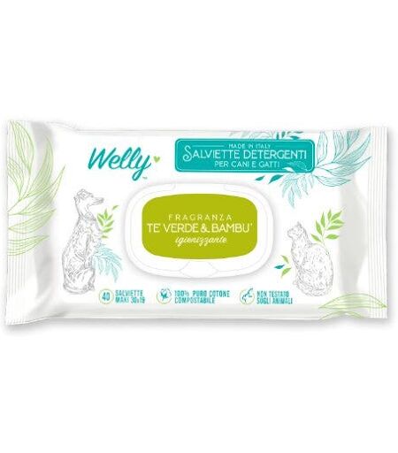 Per Detergere Quotidianamente Manto E Cute WELLY™ SALVIETTE DETERGENTI Fragranza Tè verde & Bambù sono indicate per detergere quotidianamente manto e cute di cani e gatti, lasciando il mantello del pet gradevolmente profumato e igienizzato grazie alla presenza dell’olio di Tea Tree, noto per le sue proprietà antimicrobiche. Welly™ Salviette Detergenti Tè verde & Bambù Igienizzante contengono estratto di tè verde e olio essenziale di tea tree biologici per una detersione profonda ed efficace, ma naturalmente delicata e nel rispetto del pH della cute del Pet. Le salviette Welly™ sono Made in Italy e realizzate in morbido cotone 100% compostabile e biodegradabile. Sono disponibili in 6 gradevoli profumazioni, hanno dimensioni maxi 30 x 19 cm e in confezioni da 40 pezzi. Tutte le salviette Welly™ contengono estratti biologici naturali per una detersione profonda ed efficace ma naturalmente delicata, lasciando il mantello del Pet gradevolmente profumato. Sono adatte per cani e gatti. ...