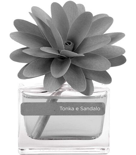 Diffusore D'Ambiente Di Muhà. Profumatore Per Ambiente In Una Raffinata Confezione Di Vetro Con Diffusore A Forma Di Fiore In Legno Di Betulla Naturale Realizzato A Mano.. Fragranza: Tonka E Sandalo: Fragranza Che Rappresenta Una Fusione Maestosa Di ...