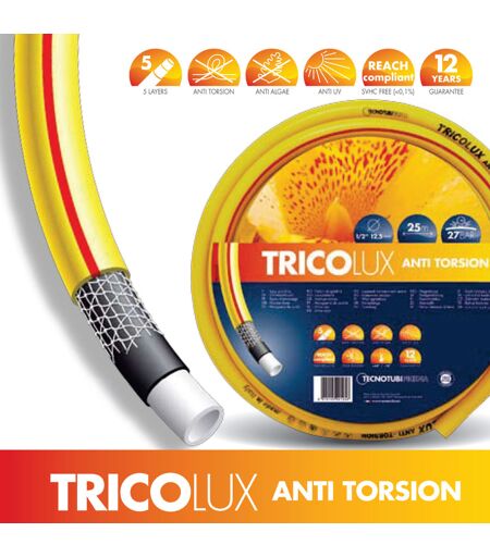 Tubo Tricot per irrigazione e giardinaggio realizzato in PVC e rinforzato 5 strati. Elevati standard qualitativi, evita torsioni e strozzamenti durante l’utilizzo. Dotato di rinforzo magliato Anti Torsione in poliestere ad alta tenacità. Maneggevole, flessibile e anti schiacciamento, resistente fino ad una pressione massima di scoppio 27 Bar. Atossico, anti-alga e anti UV. Made in ITALY, Garantito 12 anni. Disponibile nelle seguenti misure, selezionabili dal menù a tendina: Diametro 1”(25mm) - Lunghezza 25mt - Pressione Max 21Bar Diametro 1”(25mm) - Lunghezza 50mt - Pressione Max 21Bar Diametro 1/2”(13mm) - Lunghezza15mt - Pressione Max 27Bar Diametro 1/2”(13mm) - Lunghezza 25mt - Pressione Max 27Bar Diametro 1/2”(13mm) - Lunghezza 50mt - Pressione Max 27Bar Diametro 3/4”(19mm) - Lunghezza 25mt - Pressione Max 24Bar Diametro 3/4”(19mm) - Lunghezza 25mt - Pressione Max 24Bar Diametro 5/8”(15mm) - Lunghezza 15mt - Pressione Max 27Bar Diametro 5/8”(15mm) - Lunghezza 25mt - Pressione Max ...