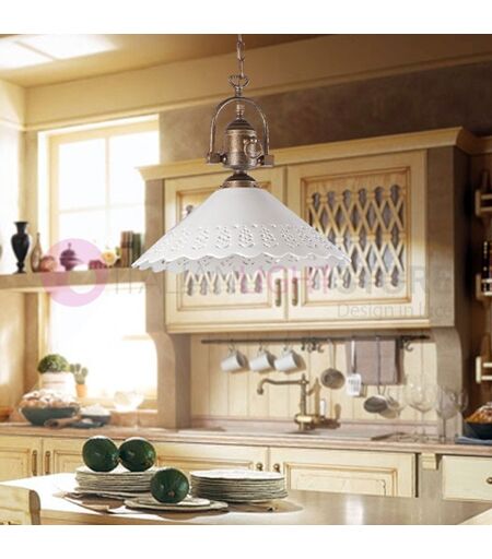 Lampadario sospensione con struttura ottone anticato e diffusore in ceramica in stile classico rustico country, collezione Volterra di Ceramiche Borso. La lampada ha diffusore in ceramica bianca lucida traforata a forma di cono smerlato; struttura in ottone anticato lavorato artigianalmente, sospesa da una catenella regolabile in altezza. La collezione di lampadari in ceramica Volterra è ispirata al passato e ripropone materiali classici come ceramica, ferro e ottone, sapientemente lavorati da artigiani secondo antiche tradizioni. Comprende le lampade a sospensione, le appliques a parete, lampadari e plafoniere con struttura in ferro o ottone (VEDI CORRELATI). Produzione 100% Made in Italy. Dimensioni: diffusore D. 40 cm, h.tot. variabile. Illuminazione diretta verso il basso Elettrificazione: 1 x E27 max 100W Lampadina non fornita (possono essere utilizzate lampadine a basso consumo o led). Per interni. ...