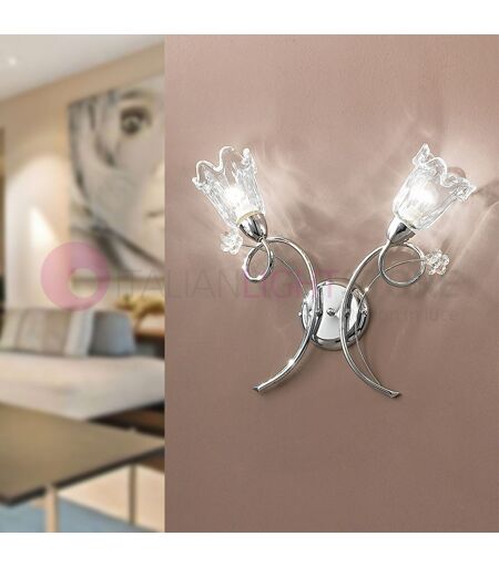 Applique a 2 Luci con struttura in metallo cromato arricchita da bellissimi cristalli a forma di fiore disponibili nei colori TRASPARENTE (CRISTALLO), AMBRA e AMETISTA; diffusori in vetro bianco e trasparente. La collezione BETTA comprende lampadari, plafoniere, lampade da parete e da tavolo e si adatta sia ad ambienti classici che moderni, grazie al suo design ricercato e piacevole. ELETTRIFICAZIONE: ATTACCO E14, 2 X MAX 33W, adatto a lampadine con attacco E14 a led (NON INCLUSE). DIMENSIONI: L. 50 x h. 40 CM. - sporgenza 15 CM. PERSONALIZZAZIONE DEI COLORI DEI FIORI: i fiori della serie Betta sono disponibili in 3 colori a Vostra scelta: Vi preghiamo indicarci il colore da Voi scelto nelle note dell' ordine o tramite mail; nulla ricevendo, il colore dei fiori sarà come foto. Inoltre, è possibile scegliere fra combinazioni di colori dei fiori (ex: cristallo e ametista, etc), inserendo nelle note i colori preferiti o inviando una mail. Made in Italy ...