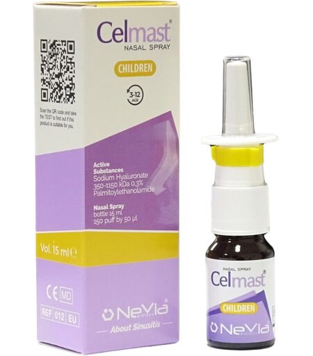 Celmast CHILDREN Descrizione Spray nasale indicato nelle riniti e rinosinusiti vasomotorie non allergiche cellulo-mediate (NARNE, NARES, NARMA e NARESMA), nelle riniti e rinosinusiti vasomotorie allergiche (IgE mediate) di grado lieve e moderato, nonché nei soggetti sottoposti a intervento chirurgico FESS (Functional Endoscopic Sinus Surgery), per creare un effetto protettivo sulla mucosa respiratoria e favorire la riparazione tissutale anatomica e funzionale. È utile nel trattamento delle riniti e rinosinusiti vasomotorie sopra indicate quando è presente rinorrea acquosa associata a uno o più dei seguenti sintomi: - starnuti (anche a salve); - naso chiuso in entrambe le narici; - prurito nasale; - congiuntivite con occhi rossi o pruriginosi. CELMAST esplica un'azione protettiva della mucosa respiratoria attraverso l'effetto barriera fornito dall'acido ialuronico ad alto e basso peso molecolare, favorendo la riparazione tessutale. Inoltre, esplica un'azione di protezione delle mastcellule riducendone la reattività sensibilizzata e diminuisce la produzione e la migrazione di eosinofili e neutrofili responsabili dell'infiammazione, del danneggiamento della mucosa e l'insorgenza della sintomatologia sopra descritta. Modalità d'uso Per bambini (3-12 anni): Spray nasale: 1 o 2 erogazioni per narice due volte al giorno (mattina e sera). Durata minima: almeno 10 giorni; può essere prolungato fino a venti giorni al mese per tre mesi consecutivi. Per spray nasale (bambini e adulti) 1) Soffiare il naso per rimuovere muco o residui per permettere al prodotto di raggiungere efficacemente le aree nasali. 2) Agitare prima dell'uso. 3) Togliere la sicurezza dell'erogatore e il cappuccio protettivo. 4) Caricare la pompetta premendo 2-3 volte finché si ottiene una nebulizzazione regolare. 5) Inserire delicatamente l'erogatore in una narice, mantenendo la testa eretta e inclinata leggermente in avanti. 6) Premere una volta lo spray mentre si inspira lentamente attraverso il naso. 7) Ripetere nell'altra narice seguendo le stesse modalità. Note: non espirare e non soffiarsi il naso subito dopo l'applicazione per non disperdere il prodotto (attendere 10-15 minuti). L'uso nei bambini deve essere supervisionato o coadiuvato da un adulto. Componenti Sostanze funzionali: sodio ialuronato 350-1.150 KDa allo 0,3% (acido ialuronico sale sodico), palmitoiletanolamide. Eccipienti: acqua purificata FU, alcool etilico, aroma menta, eucaliptolo, paraossibenzoato di metile, paraossibenzoato di propile, polisorbato 80, sodio cloruro, sodio fosfato monosodico biidrato (o acido citrico monoidrato), sodio fosfato bisodico dodecaidrato (o sodio citrato biidrato). Avvertenze - Effettuare tutte le operazioni di somministrazione con delicatezza, evitando di inserire troppo profondamente la punta dell'erogatore nelle narici e mantenendo la posizione eretta durante l'uso. - Chiudere bene il flacone dopo ogni applicazione. - Conservare il prodotto lontano dalla luce e da fonti di calore... ...