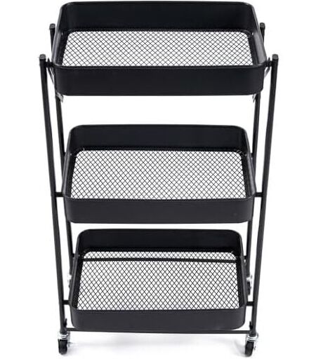 Pieghevole e richiudibile in poco spazio Con ruote Materiale Metallo Dimensioni: 88x45x29.5 cm (HxLxP) Dimensione da chiuso: 7,5x45,5x103 cm Colore Nero Pratico carrello universale in metallo per usufruire di spazio extra. Questo carrello a 3 livelli è realizzato con un robusto telaio in acciaio al carbonio e un cestello in metallo resistente con fondo reticolare. Ideale per servire pietanze e bibite o come tavolino portaoggetti, porta trucchi in bagno, organizer in ufficio o per attrezzi fai da te. Dimensione da chiuso: 7,5x45,5x103 cm. ...