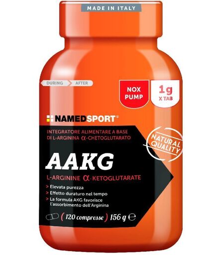 Gli integratori non sostituiscono un’alimentazione equilibrata e variegata e uno stile di vita sano. Aakg è un integratore alimentare a base di Arginina α-Ketoglutarato. L’Arginina è un Aminoacido condizionatamente essenziale, particolarmente utile per lo sportivo. L’ Arginina, infatti, è coinvolta in importanti funzioni biologiche. È coinvolta nella sintesi proteica e nel metabolismo energetico. È un precursore dell’Ossido Nitrico (No), il più potente vasodilatatore, che aiuta a convogliare maggiori sostanze nutritive nei muscoli e nei tessuti, migliorando la performance sportiva. È un precursore della Creatina, che aumenta la forza e la potenza, risultando utile per chi pratica sport, anche a livelli agonistici. Possiede un’importante azione detossificante: è un prodotto intermedio del ciclo dell’Urea e contribuisce a detossificare l’organismo; contrastando il senso di fatica determinato dall’accumulo di ammoniaca. Potenzia le difese immunitarie in quanto stimola la produzione di Linfociti T. L’assorbimento dell’Arginina è ottimizzato grazie alla speciale formula AKG (α-Ketoglutarato): il sale dell’Arginina ottenuto attraverso la combinazione di due molecole di Arginina e una di α-Ketoglutarato. Tale associazione, oltre a migliorare la stabilità dell’Arginina in ambiente liquido, ne migliora le capacità ergogeniche, considerata l’attività pro-energetica di questo prodotto intermedio, fondamentale del ciclo di Krebs. Aumenta la forza e la potenza Incrementa il livello energetico Migliora il recupero Favorisce la performance sportiva Contribuisce al mantenimento della salute del sistema cardiovascolare Ingredienti:L-Arginina α -chetoglutarato, agente di carica: cellulosa; agenti antiagglomeranti: sali di magnesio degli acidi grassi, biossido di silicio. Analisi media Per 4cpr L-Arginina a-chetoglutarato 4 g Modo d'uso:Si consiglia di assumere 4 compresse al giorno con acqua o altro liquido, preferibilmente a stomaco pieno. Avvertenze:Non superare la dose giornaliera raccomandata.Tenere fuori dalla portata dei bambini al di sotto dei tre anni. Conservazione:Conservare in luogo fresco ed asciutto al riparo dalla luce, dalle fonti di calore localizzate e dai raggi solari ed evitare il contatto con l’acqua. Contenuto netto:120 compresse = 156 g Produttore:Named S.p.A. Via Lega Lombarda, 33 20855 Lesmo MB Italia ...