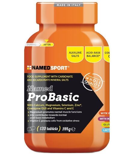 Gli integratori non sostituiscono un’alimentazione equilibrata e variegata e uno stile di vita sano. Sali minerali Carbonati e Bicarbonati per l’equilibrio acido-base, con Vitamine antiossidanti e Coenzima Q10. Sali minerali alcalinizzanti*e Vitamine, con Coenzima Q10 Integratore alimentare alcalinizzante* a base di Sali Minerali carbonati e bicarbonati, Vitamine e Coenzima Q10. La speciale formulazione di Named Probasic è stata appositamente studiata per il post-workout. Il Calcio e il Magnesio contribuiscono alla normale funzionalità muscolare, lo Zinco* contribuisce al normale metabolismo acido-base e le Vitamine C e E contribuiscono alla protezione delle cellule dallo stress ossidativo prodotto da un allenamento intenso. Arricchito con Coenzima Q10. Sali minerali in forma di Carbonati e Bicarbonati Lo Zinco contribuisce al normale metabolismo Acido- Base Arricchito con Vitamine C ed E ad azione antiossidante Con Vitamine del Gruppo B ad azione pro-energetica Ideale per sostenere la fisiologica fase di recupero Ingredienti:Carbonato di calcio, Bicarbonato di sodio, Carbonato di magnesio, Agente di carica: Cellulosa; Bicarbonato di potassio, Stabilizzante: mono e digliceridi degli acidi grassi; Vitamina C (acido-L-ascorbico), Agenti antiagglomeranti: Sali di magnesio degli acidi grassi e Biossido di silicio; Sodio fosfato monobasico, Zinco L-Pidolato, Coenzima Q10, Vitamina E (D-alfa-tocoferile acetato), Vitamina B6 (piridossina cloridrato), Selenito di sodio, Vitamina B12 (cianocobalamina). Analisi media 4 cpr *Vnr% Calcio carbonato 1200 mg di cui calcio 420 mg 52,5 Magnesio carbonato 960 mg di cui magnesio 230 mg 61 Selenio 64 mcg 116 Zinco 12 mg 120 Vitamina C/ 120 mg 150 Vitamina E/ 16 mg 133 Vitamina B6 1,9 mg 136 Vitamina B12 3,3 mcg 132 Coenzima Q10 48 mg Sodio bicarbonato 1040 mg di cui sodio 304,7 mg *Vnr = Valori Nutritivi di Riferimento Modo d'uso:Si consiglia l’assunzione di 4 compresse al giorno, con abbondante acqua. Avvertenze:Non superare la dose giornaliera raccomandata.Tenere fuori dalla portata dei bambini al di sotto dei tre anni. Conservazione:Conservare in luogo fresco ed asciutto al riparo dalla luce, dalle fonti di calore localizzate e dai raggi solari ed evitare il contatto con l’acqua. Contenuto netto:120 compresse = 144 g Produttore:Named S.p.A. Via Lega Lombarda, 33 20855 Lesmo MB Italia ...