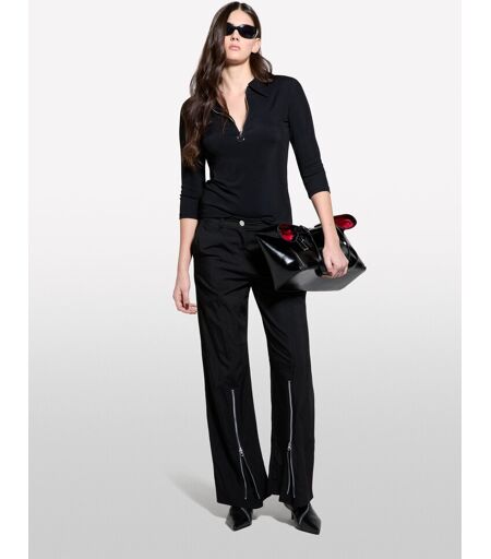 Pantaloni palazzo neri in misto viscosa e nylon, con motivo di tagli verticali sul centro. Vita bassa con elastico sul centro dietro, chiusura con zip e bottone, due tasche alla francese e dettaglio di maxi cerniera con tirazip apribile sul fondo davanti. ...