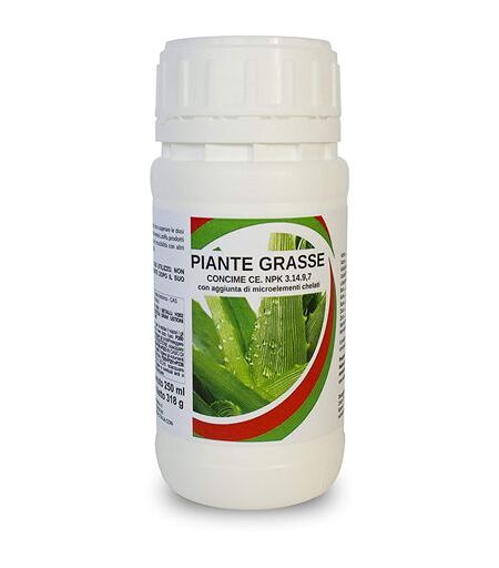 Soluzione di concime NPK 3.14.9,7 con aggiunta di Boro, Rame e Zinco Prodotto ideale per la coltivazione di tutte le piante grasse in giardino, casa, balcone e terrazzo. Il prodotto contiene microelementi in forma chelata che consentono alla pianta uno sviluppo equilibrato e una ottima fioritura. Utilizzare il prodotto durante l'intero ciclo vegetativo della pianta. Il prodotto puo' essere utilizzato durante tutto l'anno intensificando i trattamenti durante il periodo primaverile e estivo. Diluire 25 ml di prodotto ogni 10 litri d'acqua. Irrorare accuratamente pianta e terreno. Ripetere i trattamenti ogni 10 - 15 giorni. Durante i mesi invernali si consigliano trattamenti ogni 45 giorni. ...