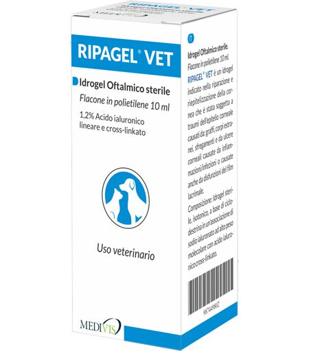 RIPAGEL VET - Descrizione Idrogel, sterile, isotonico, costituito da un'associazione all'1,2% di acido ialuronico ad alto peso molecolare a lunga catena e di acido ialuronico cross - linkato. Contiene ciclodestrina e povidone ioduro (PVP - I). Grazie all'elevata concentrazione in acido ialuronico i… ...
