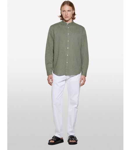 Camicia verde alla corena in misto cotone e lino. Collo guru, abbottonatura frontale, maniche lunghe con spalla morbida e fondo stondato. Articolo realizzato con materiale contenente almeno il 50% di lino coltivato in Europa. ...