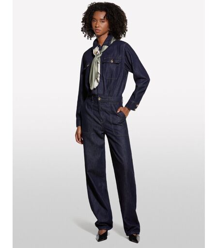 Tuta in denim di misto cotone e lyocell, lavaggio rinse con cuciture color tabacco. Camicia con colletto, chiusura nascosta con bottoni a pressione, maniche lunghe con spalla morbida e due tasche a toppa chiuse da bottoni gold; pantaloni con passanti in vita, chiusura a zip e bottone, due tasche all'americana davanti e due tasche a toppa dietro. ...