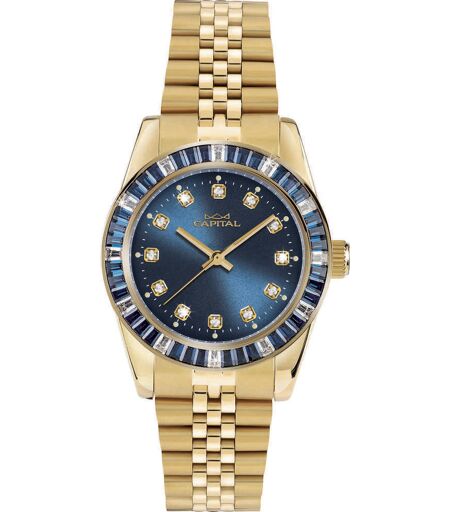 Orologio Solo Tempo Da Donna Di Capital Della Collezione New York. Orologio Con Cassa In Acciaio Laminato Di Forma Rotonda, Ghiera Con Pietre Colorate Incassate Da 32 Mm. Orologio Con Quadrante Effetto Sunray Con Pietre Di Colore Blu. Bracciale In ...