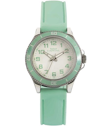 Orologio Solo Tempo Da Donna Di Capital Della Collezione Junior. Orologio Con Cassa In Acciaio Di Forma Rotonda Con Ghiera Girevole Rosa Da 34 Mm. Orologio Con Quadrante Bianco Con Numeri Arabi Verdi Di Colore Bianco. Cinturino In Silicone Verde Di ...