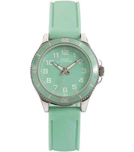 Orologio Solo Tempo Da Donna Di Capital Della Collezione Junior. Orologio Con Cassa In Acciaio Di Forma Rotonda Con Ghiera Girevole Verde Da 34 Mm. Orologio Con Quadrante Verde Con Numeri Arabi Bianchi Di Colore Verde. Cinturino In Silicone Verde Di ...