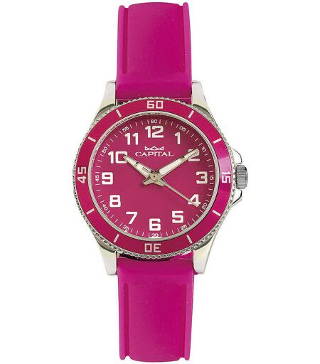 Orologio Solo Tempo Da Donna Di Capital Della Collezione Junior. Orologio Con Cassa In Acciaio Di Forma Rotonda Con Ghiera Girevole Rosa Da 34 Mm. Orologio Con Quadrante Rosa Con Numeri Arabi Bianchi Di Colore Rosa. Cinturino In Silicone Rosa Di ...