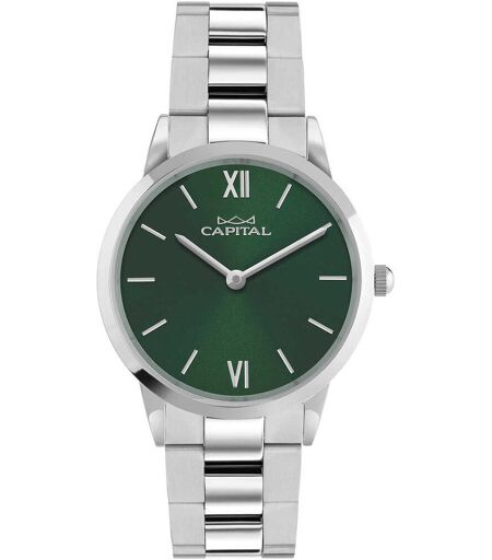 Orologio Solo Tempo Da Donna Di Capital Della Collezione Paris. Orologio Con Cassa In Acciaio Di Forma Rotonda Della Misura 32mm. Orologio Con Quadrante Di Colore Verde Sunray Con Numeri Romani E Indici. Bracciale In Acciaio Di Lunghezza Standard, Misura ...