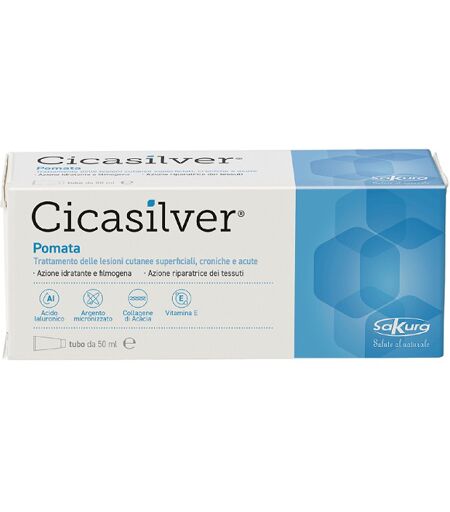 Cicasilver Pomata - Descrizione Dispositivo medico a base di acido ialuronico collagene di acacia vitamina E e argento micronizzato. L'acido ialuronico e il collagene di acacia grazie alle proprietà idratanti e filmogene assicurano una corretta umidificazione del microambiente della ferita e fa… ...